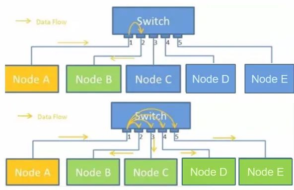以太网为交换机式(Switched Network)通信方式,网络中存在终端节点和交换机节点,所有终端节点都需要经过交换机节点的转发才能进行通讯。终端节点有且只有一个以太网端口,而一个交换机节点有多个以太网端口。以太网能够提供更高的带宽和交换网络,具有非常强大的通信能力。以太网以一对一或一对多两种方式进行通信,一对一的方式中发送节点的报文中涵盖自己和一个接收节点的地址;一对多的方式中发送节点的报文中涵盖自己和多个接收节点的地址。二者都不影响其他节点的通信。