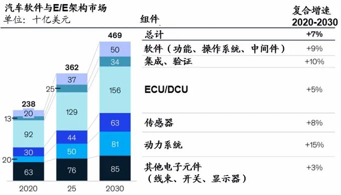 汽车软件和E/E架构组件市场正处于快速扩张阶段。2020年,软件与E/E架构组件市场规模达2380亿美元,其中ECU/DCU市场规模达920亿美元,占比接近40%。