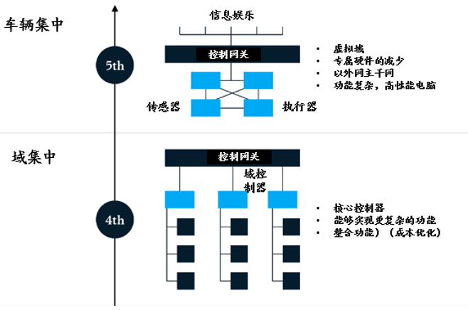 变革的前三个阶段分别对应ECU、DCU、MDC主导的三个阶段。目前大部分车企处于第三代E/E分布式体系并向第四代集中化体系迈步。