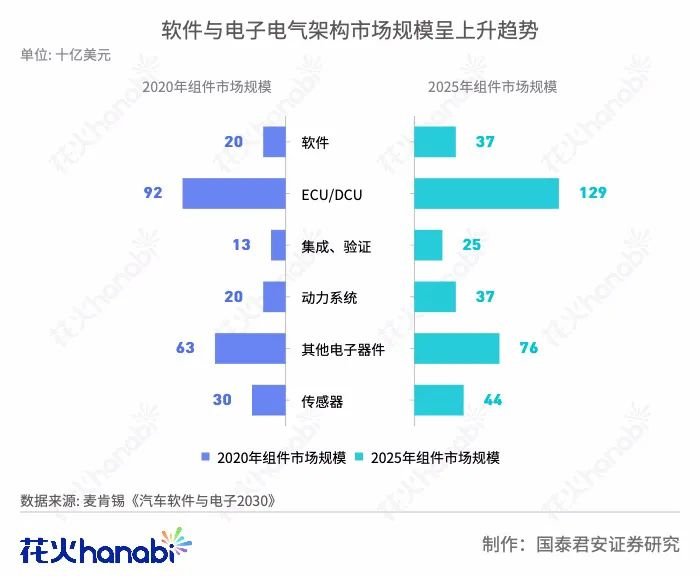 电子电气架构的变革将同步影响组件市场。DCU、ECU、传感器及其他电子器件市场将进一步发展为更加成熟和独立的市场。