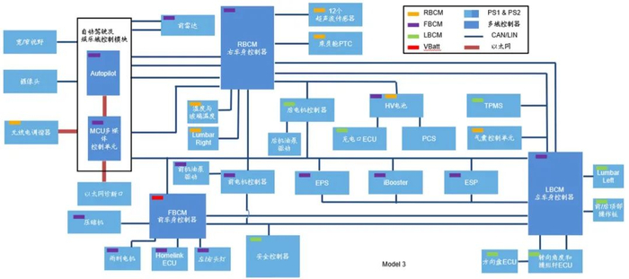Model 3四大控制器:AICM(辅助驾驶及娱乐控制模块)、BCM RH(右车身控制器)、BCM LH(左车身控制器)以及BCM FH(前车身控制器)控制着整辆车几乎所有功能。
