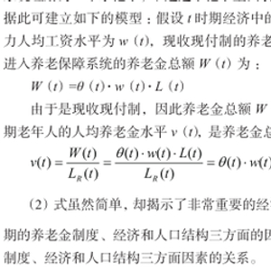 需要说明的是,这里的人均养老金水平 v(t)是一种理论上的老年人可分享的养老待遇水平,并不是实际支付给老年人的养老金。在上述模型中,养老金总额 W(t)是现收现付养老金系统的收入,或者说是养老金的一种储备,而如何支出、使用这些养老金则是另一层面的问题。在现实经济中,养老保障系统一般并不是将当期全部的养老金收入支付给当期的老年人,而是留有一定的“余地”。