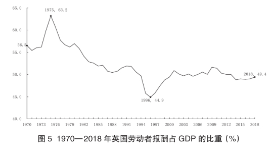 受数据资源的限制,其他国家的数据没有同美国数据的样本期那样长。可获取的英国、德国及日本的数据样本期起点主要是 1970 年以后。图 5 是 1970—2018 年期间英国劳动者报酬占GDP 比重的数据图。可以看到,在 1970—2018 年期间,英国劳动者报酬比重总体上呈现下降趋势。该比重从 1975 年的 63.2%,下降至 2018 年的 49.4%,即降低 13.9 个百分点。