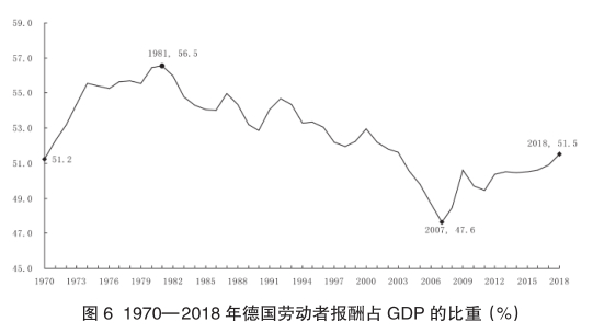 图 6 是 1970—2018 年期间德国劳动者报酬占 GDP 比重的数据图,可以看到德国同英国的情况大致相同,即劳动者报酬占 GDP 的比重呈现先上升后下降的总体变化趋势。