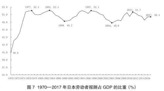 图 7 是 1970—2017 年期间日本劳动者报酬占 GDP 比重的数据图。可以看到在 1970—1977年期间日本劳动者报酬占 GDP 比重是上升的,然而在 1977 年后则呈现波动性下降的趋势。