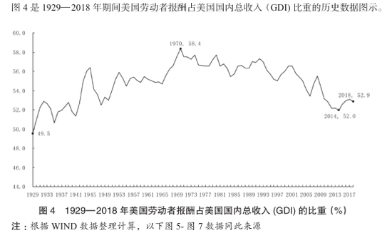 图 4 是 1929—2018 年期间美国劳动者报酬占美国国内总收入(GDI) 比重的历史数据图示。