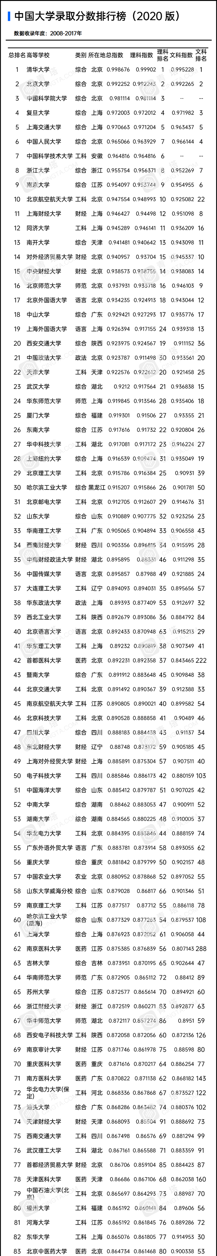该榜单完全基于各大高校在过去10年(2008-2017)间,在各省本科第一批录取的文理科分数及人数的指标数据,通过统计分析后转换编辑完成的。