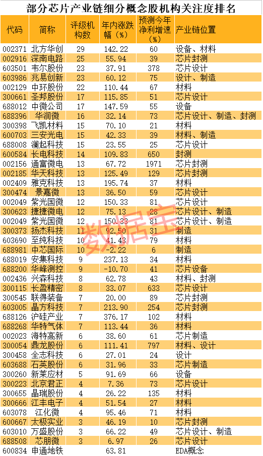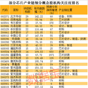 数据宝梳理了受上述政策利好的集成电路产业链相关概念,包括芯片材料、芯片封装测试、芯片设备、芯片设计、芯片制造等细分领域,此外还包括了龙头中芯国际概念以及集成电路设计软件EDA等概念,从市场表现、市值、概念相关性、机构关注度、未来成长性等角度粗略筛选出产业链细分高成长龙头,以飨读者。具体名单见下表。