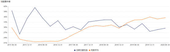 基金定期报告显示,2019年一季度以来,交银主题持股集中度开始低于同类型产品均值。