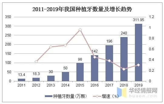 我国种植牙数量呈不断增长态势,到2019年已达到311.95万颗,我国是全球增长最快的种植牙市场之一。