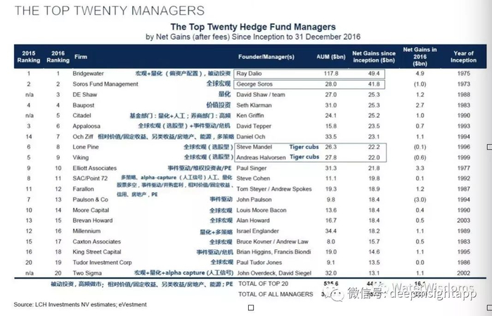 如果从投资能力的角度看,索罗斯基金以更小的管理规模,为客户赚到了比例更大的钱。相反,桥水虽然为客户赚到的钱比索罗斯基金多了80亿美元,但是管理规模比索罗斯基金多了800亿,收益率的比例并不高。但是我们从运营一家资产管理公司的角度看,毫无疑问是桥水更成功。过去30年全球对冲基金行业一哥的位置基本上被两家机构把持,前20年是索罗斯基金,后10年就是桥水,中间有几年是罗伯逊的老虎基金。从今天的结果看,我认为桥水基金的成就已经远远超过索罗斯基金了。这个不仅仅体现在规模超越了索罗斯基金不是一个数量级,更重要的是达里奥正在把桥水打造成一个百年老店,即使他退休之后也不受任何影响。