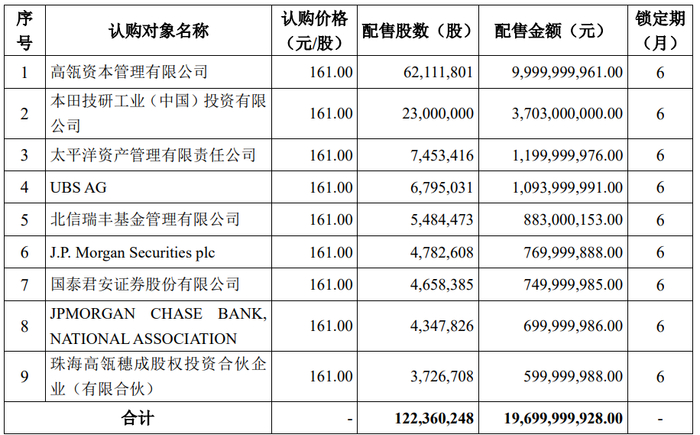 最终高瓴资本管理有限公司、本田技研工业(中国)投资有限公司、太平洋资产管理有限责任公司、UBS AG、北信瑞丰基金管理有限公司、J.P.Morgan Securities plc等9家机构成功获配。其中,高瓴资本获配100亿元,本田获配37亿元,UBS、摩根等机构“瓜分”剩余的约60亿元。