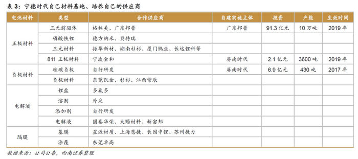 据西南证券整理,在正极材料方面由振华新材、湖南杉杉、厦门钨业(600549)、长远锂科等供应三元材料,泰丰先行、德方纳米(300769)、贝特瑞供应磷酸铁锂,格林美(002340)、广东邦普供应三元前驱体。
