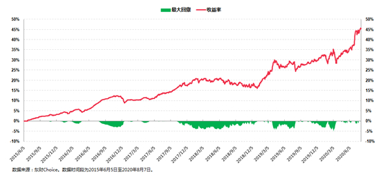从收益率的角度,这只基金在2015年6月5日到2020年8月7日期间,总收益率为45.30%,折合年化收益率为7.48%。