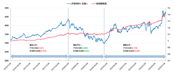 这个图是安信新优选和沪深300指数的同时段对比图,时间跨度为2016年7月28日至2020年8月7日,起点为2016年7月28日。