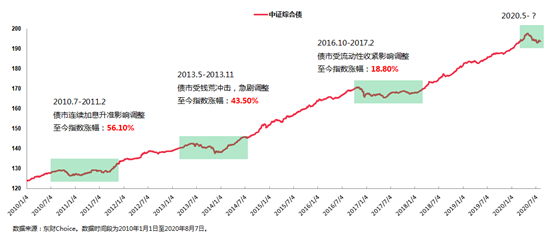 上图是中证综合债指数近十年来的历史表现,在这十年当中债市出现过三次比较大的调整,每次调整持续的时间4-6个月不等,但是不管哪一次,如果拉长时间来看的话,这三次调整每一次都是难得的长期布局时点。