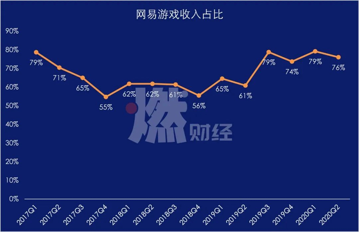 二季度,游戏在网易营收中的占比达到76%,回到了四年前的高位。过去网易大力投入做考拉和严选时,游戏收入的占比一度降到60%以下。放弃考拉后,这个比例从去年的六成,直接升至现在的近八成。