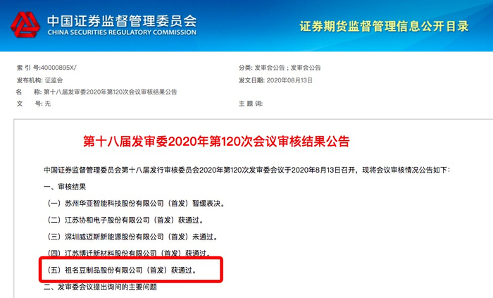 8月13日,证监会发审委表示祖名豆制品股份有限公司IPO通过审核,祖名股份计划申请深交所中小板上市,发行股票数量不超过3120万股,且发行数量占发行后总股本的比例不低于25%。