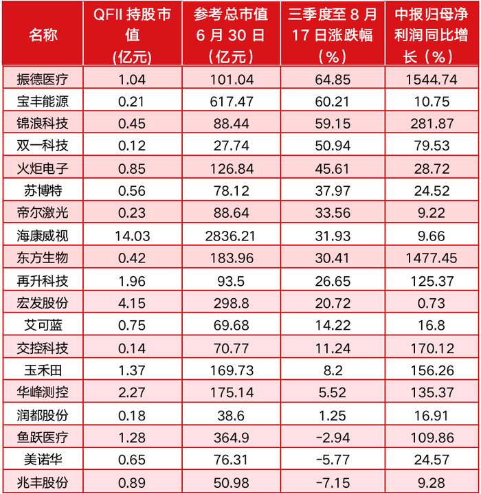 如二季度获两家QFII同时新进前十大流通股股东的振德医疗。查阅资料显示,二季度摩根大通银行共持有公司74.74万股股份,持仓市值3852.93万元。瑞士信贷(香港)有限公司持有127.42万股股份,持仓市值6568.52万元,两者分别新进振德医疗第6与第8大流通股股东。振德医疗二季度末为市值101亿元,因口罩题材,公司迎来业绩与股价双丰收。公司中报实现净利润达9.88亿元,同增1544.73%,三季度至今(8月17日,下同)涨幅达65%。