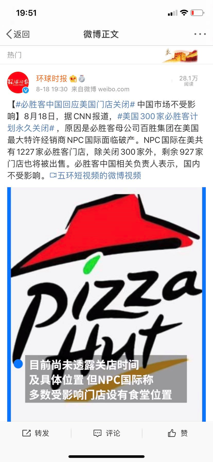 对于美国门店关闭,必胜客中国回应称:中国市场不受影响。