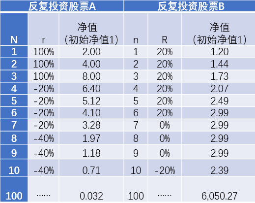 但实际上如果我们反复投资股票A和股票B,结果会如何呢?下表可以看到,如果一个产品反复投资符合股票A的概率分布的标的,10次之后净值已经从1块跌到了0.71,而反复投资股票B 10次后,净值则是从1涨到了2.39,收益率相差158%,如果反复投资A和B分别达到100次,则两者净值的差距将会更加恐怖,前者跌到了0.03,后者则涨到了6050。
