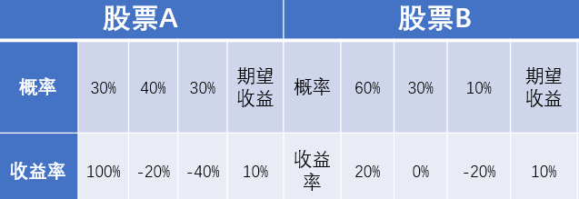 如果有以下2个股票,我们应该如何选择?有的人认为这两个股票期望收益一样,所以选A和选B是一样的,有的人喜欢追求高收益的股票,所以选A。有的人喜欢追求稳健,所以选B。