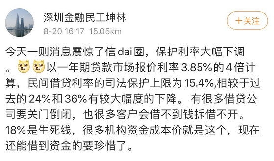 据每日经济新闻报道,苏宁金融研究院高级研究员黄大智认为,民间借贷利率的保护上限一旦设为LPR的4倍,对于众多的民间借贷机构会产生比较大的冲击。在现行的情况下,大多数民间借贷的利率基本上都是在24%~36%之间,一旦该政策实施,可能会有大批的民间借贷机构退出这个行业。