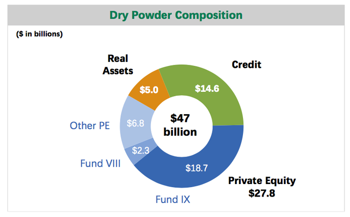 当下,阿波罗的投资“干火药”(Dry powder,即用于投资的资产)为474亿美元。其中, 183亿美元被阿波罗称为“未来具有产生管理费潜力的干火药”。