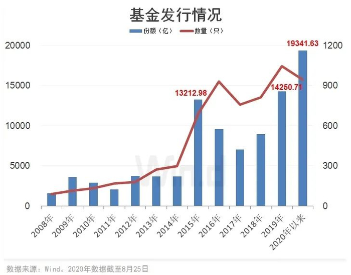 形成鲜明对比的是,年内公募基金发行规模却大幅攀升。Wind数据统计显示,今年以来至8月25日,基金发行规模1.93万亿份,远超2019年、2015年全年发行量,继续刷新历史新高。