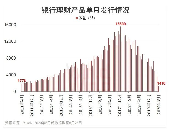 伴随着银行理财收益率的逐步下行,相关产品发行量大幅萎缩。Wind数据统示,按销售起始日期计算,今年前7个月银行理财产品合计发行3.86万只,比2019年同期下降43.3%。