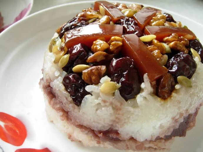 再来一笼既好看又好口彩的“水晶龙凤糕”。这是糯米做成的糕,糕面用枣子镶嵌出龙凤形状,上笼大火蒸至糯米爆花就可以吃了,米糕白亮如水晶,配上红莹莹的枣子,喜气洋溢啊。