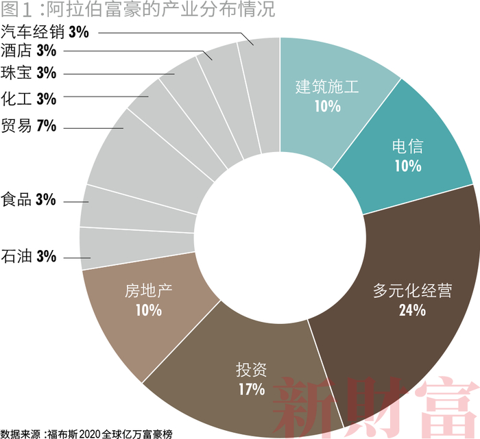 目前,阿联酋是海湾六国中非石油经济最发达的国家,非油气产业贡献了GDP的74%,阿联酋计划到2030年将这一比重提升为80%。2020福布斯全球亿万富豪榜上的阿拉伯家族共有20个,其中仅有一个家族的主要产业与石油相关(图1)。