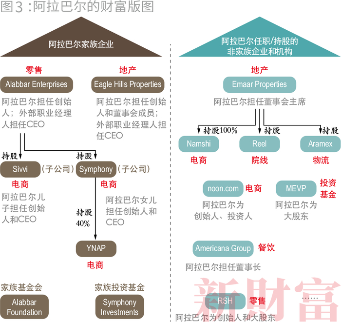 从2008年起,阿拉巴尔先后成立了家族企业Alabbar Enterprises和Eagle Hills Properties,分别经营零售和房地产业务(图3)。两家企业相互独立,没有股权关系。阿拉巴尔的子女均在Alabbar Enterprises任职,但尚无家族成员就职于Eagle Hills Properties。