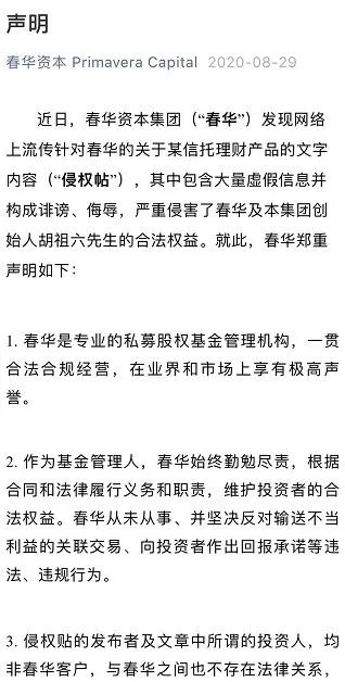 3. 侵权贴的发布者及文章中所谓的投资人,均非春华客户,与春华之间也不存在法律关系,其陈述的关键情节严重失实、毫无事实依据,且包含诋毁春华商誉和侮辱胡祖六先生名誉的恶劣内容,严重侵犯春华和胡祖六先生的合法权益。春华已于第一时间采取维权行动,并保留未来采取进一步法律行动的全部权利。