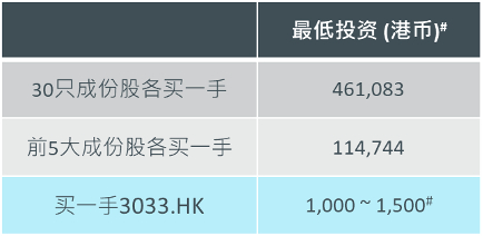 若自行建仓分散化的科技组合,各买一手恒生科技指数中的30只成份股就要花费近五十万港币,而只是布局前五大成份股也需要上十万港币。一手3033.HK只需千元港币,便可以将30只科技领袖纳入囊中。