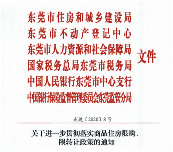 具体来看,《通知》为东莞市住房和城乡建设局、东莞市不动产登记中心、东莞市人力资源和社会保障局、国家税务总局东莞市税务局、中国人民银行东莞市中心支行、中国银行保险监督管理委员会东莞监管分局等多部门联合发布,针对东莞7月的楼市限购、限转让新政的相关问题出台了政策细则。