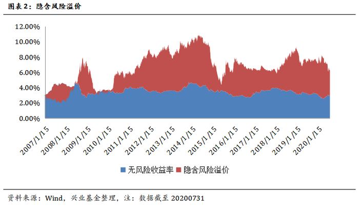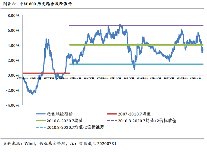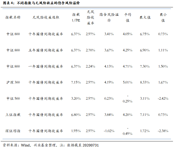 在指数的选取上我们选择中证800,截至20200731,中证800的市值为5.49万亿,全部 A股的市值为7.98万亿,中证800能够代表大部分A股,选取十年期国债到期收益率作为无风险收益率,作为投资股票资产的机会成本。