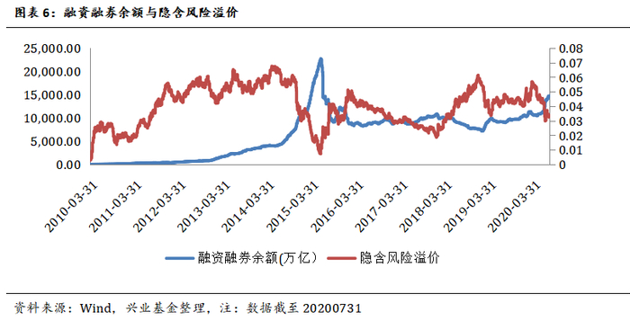 市场的风险偏好难以直接定义,可以选择融资融券余额作为风险偏好的观测指标,当融资融券余额上升时,意味着市场风险偏好上升,股权风险溢价下降,反之当融资融券余额下降时,意味着市场风险偏好下降,股权风险溢价上升。