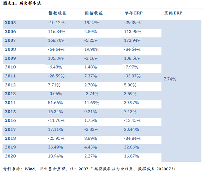 由于股票收益波动较大,因此用历史数据法算出的股权风险溢价在不同的时间窗口差别也较大。如果将2005年1月-2020年7月作为样本期则股权风险溢价为7.74%,如果选择2010年8月到2020年7月的样本期作为样本期计算股权风险溢价则为3.14%。
