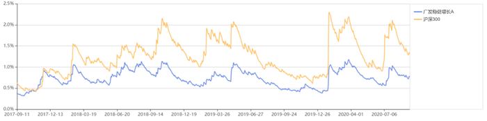 如果用波动率度量,广发稳健增长(270002)的波动率走势同样持续约为沪深300的二分之一,且波动率走势非常稳定。