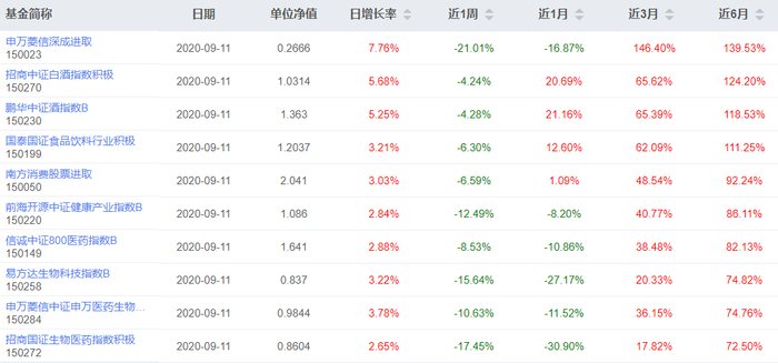 近六月涨幅最高的基金,近1周都陷入了不同规模的回撤,其中重仓科技股与消费股的申万菱信深成进取(150023)一周回撤高达21%,生物医药基金平均回撤超过10%。