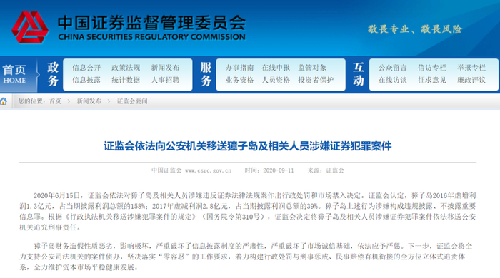 9月11日,证监会发布公告称,根据《行政执法机关移送涉嫌犯罪案件的规定》(国务院令第310号),证监会决定将獐子岛及相关人员涉嫌证券犯罪案件依法移送公安机关追究刑事责任。