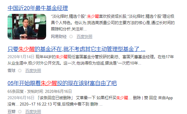 随便在百度上搜索朱少醒三个字,就可以看到网上对他的各种赞誉。比如”中国近20年最牛基金经理”,“只要朱少醒的基金还在,就不考虑其他主动型基金”,“05年开始跟着朱少醒投的现在都财富自由了”等等。各种鲜花,掌声,赞誉,吹捧!