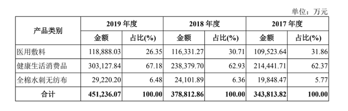 虽然从稳健医疗起家,从而衍生出健康生活消费品。但从具体业务上来看,健康生活消费品已经成为稳健医疗主要的营收来源,所占比重连年提升。2019年年度,健康生活消费品已在所有业务中,占比67.18%,收入30.13亿元。而原始业务医用敷料和全棉水刺无纺布已经在所有业务中分别占比26.35%与6.48%,为该公司第二、第三大产品类型。