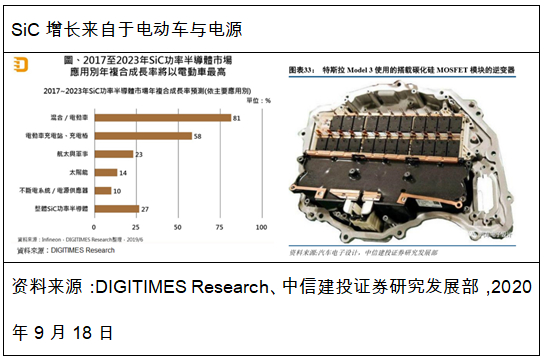 SiC器件相比前两代器件能降低电能转换过程中的能量损耗、更易实现小型化、更耐高温高压、有更高的开关频率。2018年市场规模5亿美金,预计2024年达到20亿美金,增长主要来自于新能源车逆变器与充电桩等电源领域,与IGBT构成竞争+互补关系。
