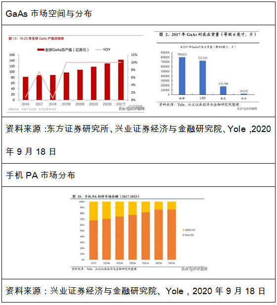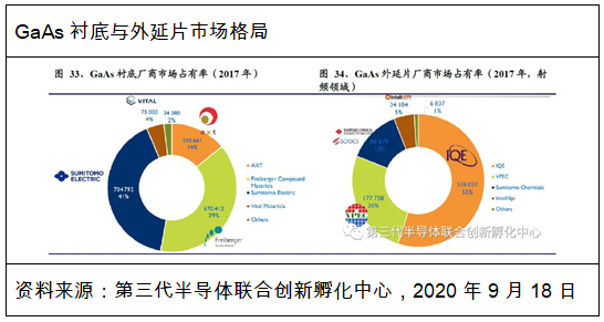 从产业链上看,砷化镓主要分为衬底、外延片、IC设计、晶圆制造、封装测试。在衬底制备(Si与GaAs两种)、砷化镓外延片方面,日本、英国、台湾、美国、德国垄断,主要厂商有Freiberg(德国费里博格)、AXT(美国)、sumitomo(日本住友电工)、IQE(英国)、VPEC等。