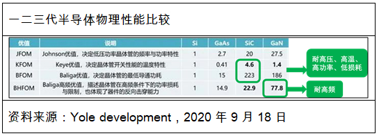 材料、结构即决定物理性能。相比一代Si半导体、二代GaAs半导体,三代GaN、SiC半导体在耐高压、耐高温、耐高功率、低损耗性、耐高频上性能远远更优秀。由此,三代化合物半导体组成的器件、设备可以支持更高的工作功率、工作频率,同时具有更小的体积、更小的能量损耗;此外,SiC比GaN更适合于大功率场景,GaN更适合高频、较高功率场景。