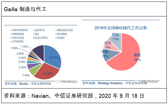 砷化镓 IC 设计方面,射频器件由国外IDM 厂商垄断,美国的高通、Skyworks、Qorvo、Broadcom四家企业占据全球智能手机GaAs功率放大器市场的90%以上。晶圆制造厂商主要有GCS、稳懋等,封测厂商主要有同欣、菱生以及台达生等。
