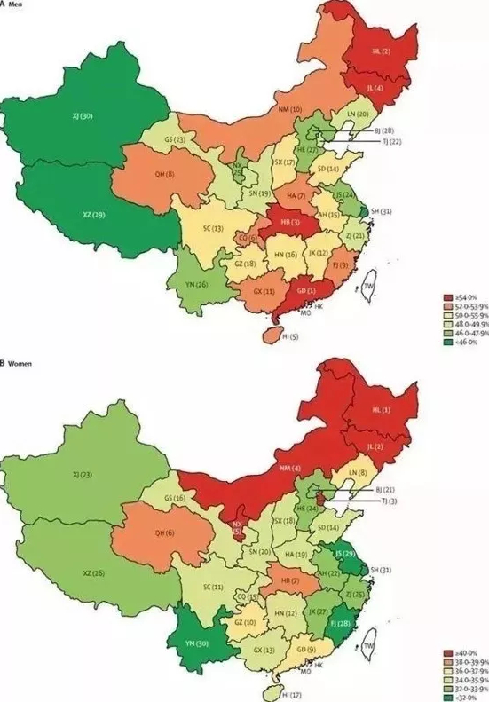 由23种可避免的导致癌症因素所占比例排名,从高到低,前五分别是黑龙江、广东、吉林、湖北、内蒙古;比例最低的五个是甘肃、云南、新疆、西藏和上海,其中上海只有35.2%的癌症死亡,是全国最低。