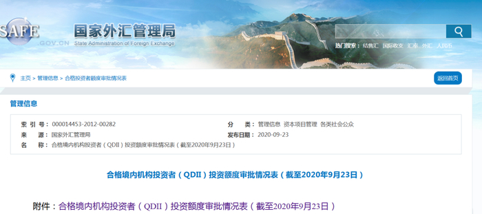 外汇管理局于9月23日发布的最新数据显示,合格境内机构投资者(QDII)投资额度审批情况表显示,截至2020年9月23日,包括银行、证券、保险、信托在内4大类157家金融机构合计累计获批1073.43亿美元QDII额度。